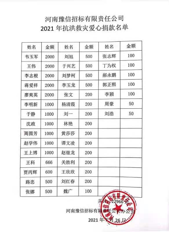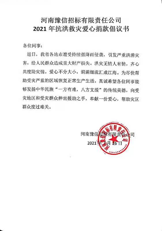 受超強降雨影響,目前河南省內抗洪救災仍在繼續(xù)!我省仍有多地汛情嚴峻,身為河南本土國有企業(yè),河南豫信招標有限責任公司 號召 公司干部職工 以實際行動幫助災區(qū)人民抗洪救災、重建家園