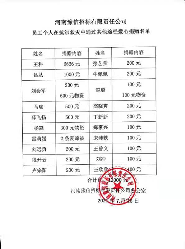 河南豫信招標有限責任公司愛心捐贈、助力抗洪
