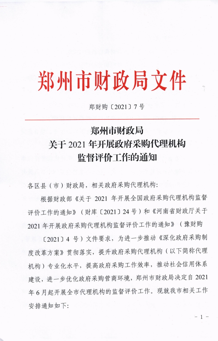 鄭州市財(cái)政局 關(guān)于2021年開(kāi)展政府采購(gòu)代理機(jī)構(gòu)監(jiān)督評(píng)價(jià)工作的通知