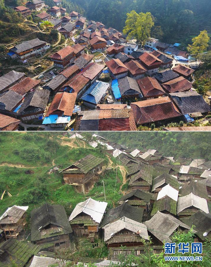 這是一張拼版照片,上圖為:2019年3月20日拍攝的烏英苗寨(無人機(jī)照片,新華社記者黃孝邦攝);下圖為:2008年9月7日拍攝的烏英苗寨(資料照片)。新華社發(fā)