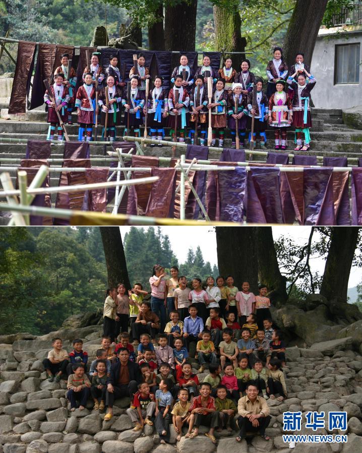 這是一張拼版照片,上圖為:2020年10月25日,烏英苗寨“雙語(yǔ)雙向”培訓(xùn)班的同學(xué)們?cè)诠艠湎潞嫌埃ㄐ氯A社記者黃孝邦攝);下圖為:2006年9月19日,烏英苗寨教學(xué)點(diǎn)的師生們?cè)诠艠湎潞嫌埃垵龜z)。新華社發(fā)