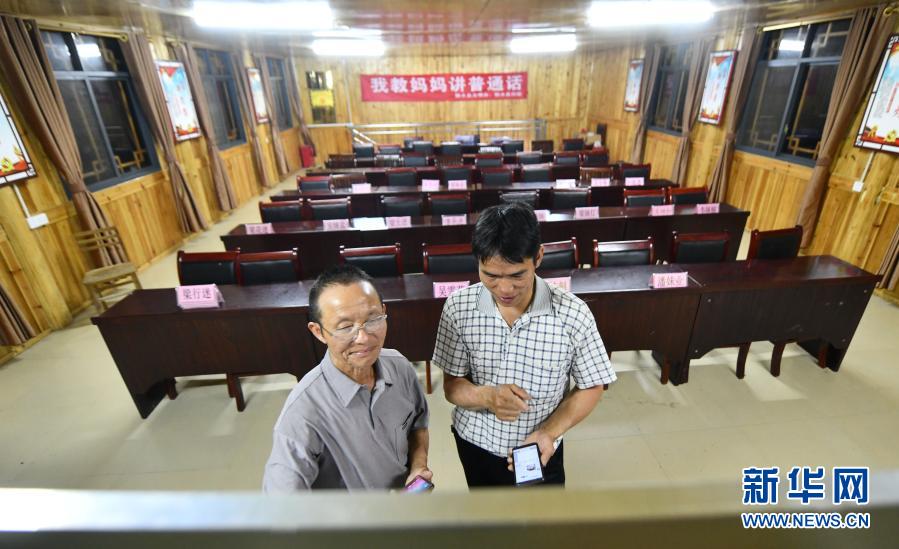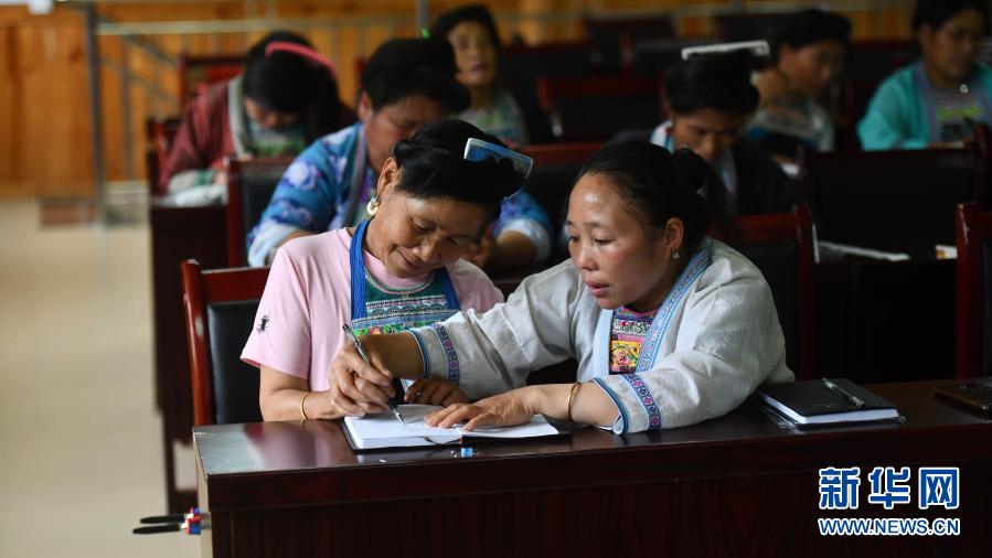 在烏英苗寨,黨鳩村村委會(huì)副主任梁秀平(右)在研究“雙語(yǔ)雙向”培訓(xùn)班的課堂內(nèi)容(6月18日攝)。新華社記者 黃孝邦 攝