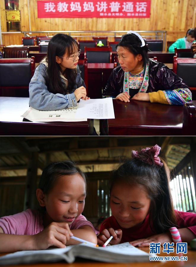 這是一張拼版照片,上圖為:2020年4月1日,在烏英苗寨“雙語(yǔ)雙向”培訓(xùn)班課堂上,大一學(xué)生潘木枝(左)在教媽媽講普通話(新華社記者黃孝邦攝);下圖為:2010年5月27日,在烏英教學(xué)點(diǎn),二年級(jí)學(xué)生潘木枝(左)在課堂上學(xué)習(xí)(龍濤攝)。新華社發(fā)