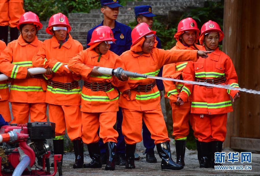烏英苗寨女子志愿消防隊(duì)隊(duì)員梁足英(右三)和隊(duì)友們?cè)谌谒h消防救援大隊(duì)消防隊(duì)員的指導(dǎo)下進(jìn)行消防演練(11月19日攝)。新華社記者 黃孝邦 攝