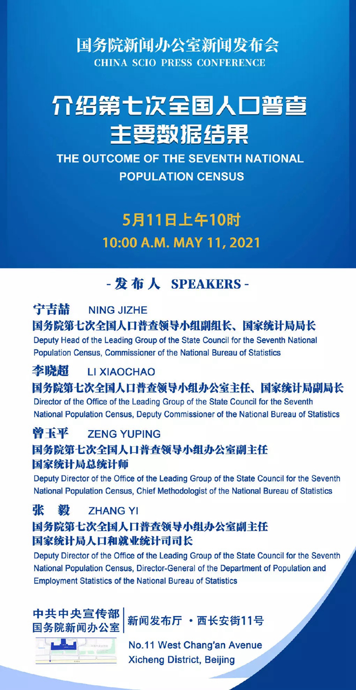 國務(wù)院新聞辦公室定于2021511日上午10時舉行新聞發(fā)布會,請國務(wù)院第七次全國人口普查領(lǐng)導小組副組長、國家統(tǒng)計局局長寧吉喆,國務(wù)院第七次全國人口普查領(lǐng)導小組辦公室主任、國家統(tǒng)計局副局長李曉超,國務(wù)院第七次全國人口普查領(lǐng)導小組辦公室副主任、國家統(tǒng)計局總統(tǒng)計師曾玉平,國務(wù)院第七次全國人口普查領(lǐng)導小組辦公室副主任、國家統(tǒng)計局人口和就業(yè)統(tǒng)計司司長張毅介紹第七次全國人口普查主要數(shù)據(jù)結(jié)果,并答記者問。