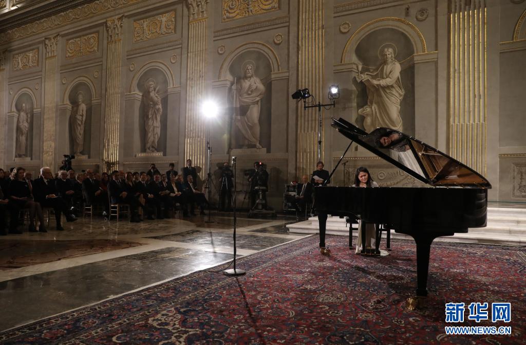 2020213日,在意大利羅馬總統(tǒng)府奎里納萊宮,旅意華人鋼琴家居覲在音樂(lè)會(huì)現(xiàn)場(chǎng)演奏。當(dāng)日,由意大利總統(tǒng)馬塔雷拉提議,在2020年中意文化旅游年計(jì)劃外加演的一場(chǎng)鋼琴獨(dú)奏音樂(lè)會(huì)在意大利總統(tǒng)府舉行,向抗擊新冠肺炎疫情的中國(guó)人民傳達(dá)友誼和支持。新華社記者 程婷婷 攝