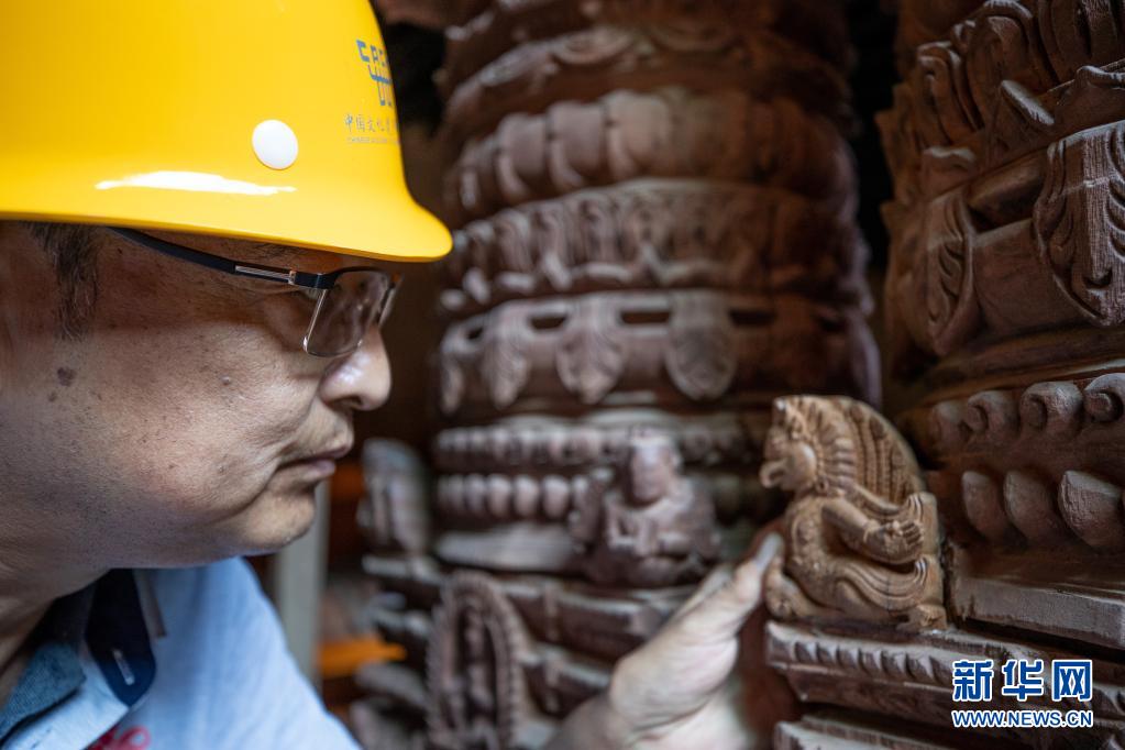 20191010日,在尼泊爾加德滿都杜巴廣場(chǎng),中國(guó)派出的文物修復(fù)隊(duì)技術(shù)主管周建國(guó)在九層神廟修復(fù)現(xiàn)場(chǎng)查看一個(gè)修復(fù)好的文物。新華社記者 王婧嬙 攝