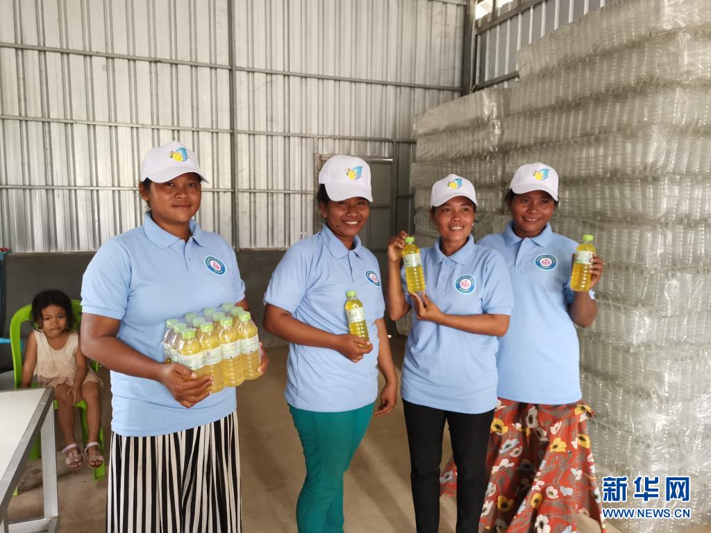 2020731日,村民在柬埔寨干丹省莫穆坎普縣斯瓦安普鄉(xiāng)的洗潔精加工廠展示生產(chǎn)的洗潔精。新華社發(fā)
