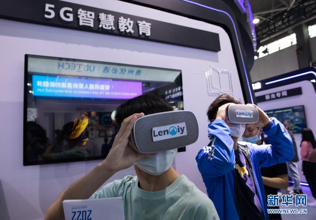 5月27日,在2021中國國際大數(shù)據(jù)產(chǎn)業(yè)博覽會展館,觀眾在體驗(yàn)5G智慧教育項(xiàng)目。新華社記者 金立旺 攝