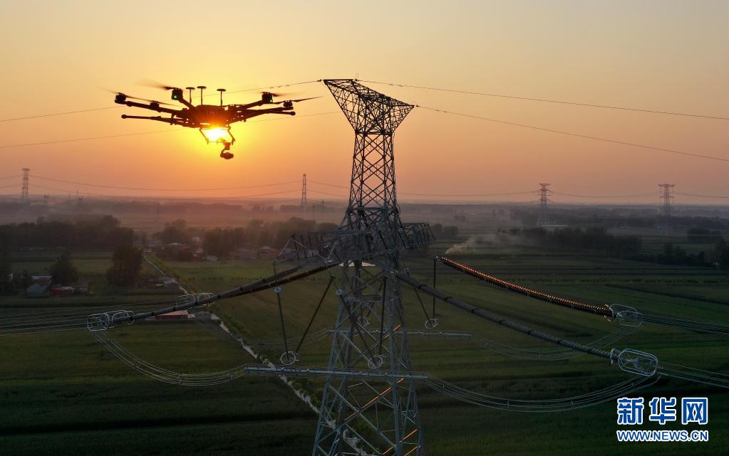 基于5G網(wǎng)絡(luò)傳輸條件下的無人機(jī)在青海—河南±800千伏特高壓直流輸電工程豫南換流變電站外巡檢(2020年8月27日拍攝,無人機(jī)照片)。新華社記者 李嘉南 攝