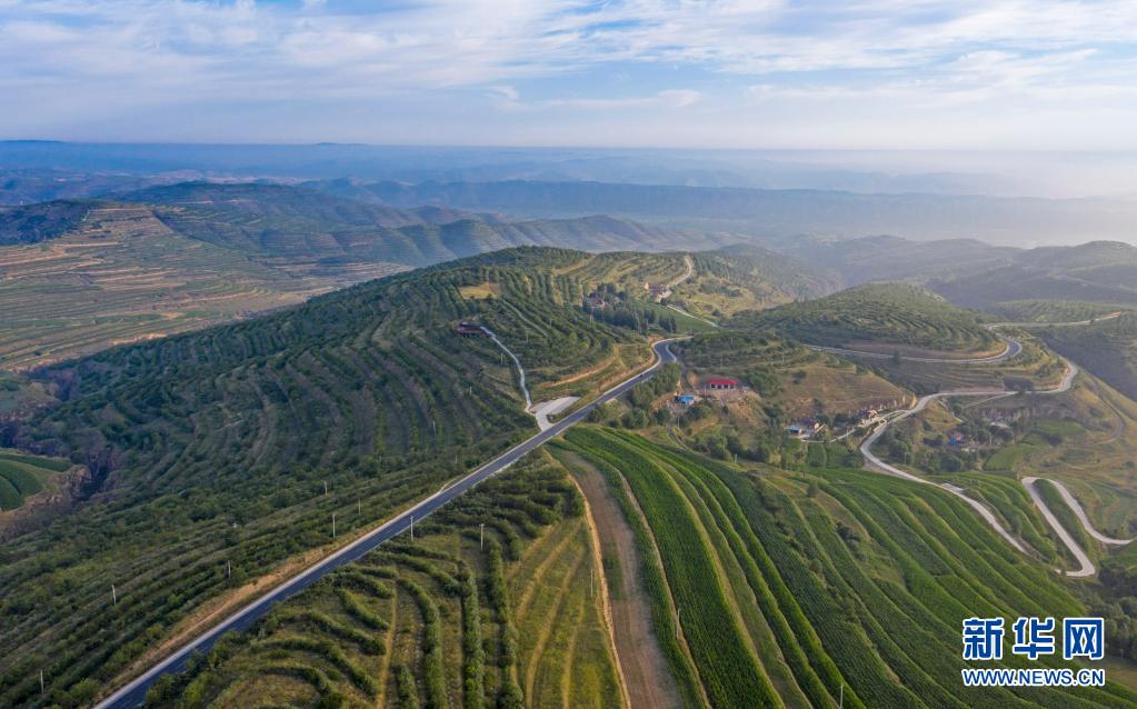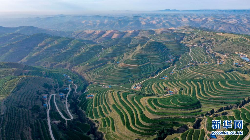 這是7月13日在寧夏固原市彭陽(yáng)縣拍攝的青云灣旱作梯田公園(無(wú)人機(jī)照片)。新華社記者 馮開(kāi)華 攝