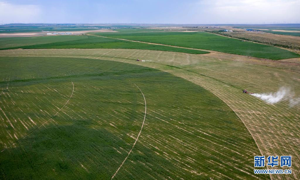 在寧夏鹽池縣馮記溝鄉(xiāng)平臺(tái)村的優(yōu)質(zhì)牧草基地,農(nóng)戶用機(jī)械收割牧草(無(wú)人機(jī)照片,7月14日攝)。新華社記者 楊植森 攝