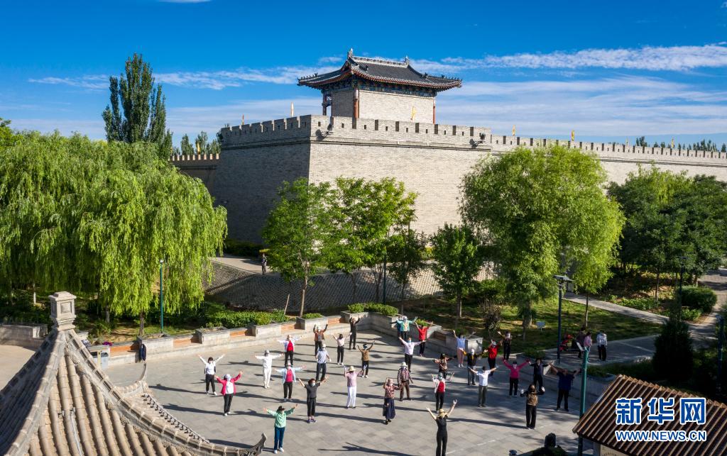 6月18日,寧夏鹽池縣居民在城墻腳下跳廣場(chǎng)舞(無(wú)人機(jī)照片)。新華社記者 馮開(kāi)華 攝