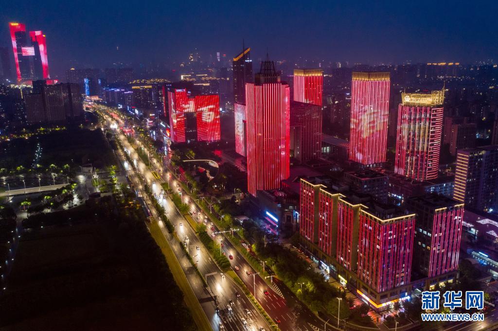 這是6月25日在南京市河西新城中軸線拍攝的慶祝建黨百年主題燈光秀(無(wú)人機(jī)照片)。新華社記者 李博 攝