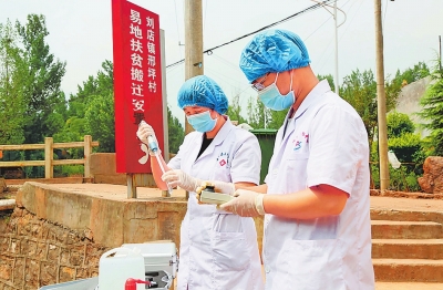 ?? 7月28日,汝陽縣疾控中心工作人員對劉店鎮(zhèn)邢坪村群眾飲用水進行抽樣化驗。 康紅軍 攝