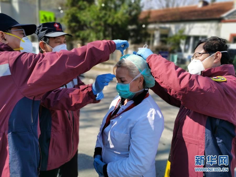 44日,中國赴塞爾維亞抗疫醫(yī)療專家組在貝爾格萊德的基層發(fā)熱門診走訪時(shí),幫助塞爾維亞醫(yī)生特里富諾維奇(中)佩戴高標(biāo)準(zhǔn)的防護(hù)口罩。新華社發(fā)
