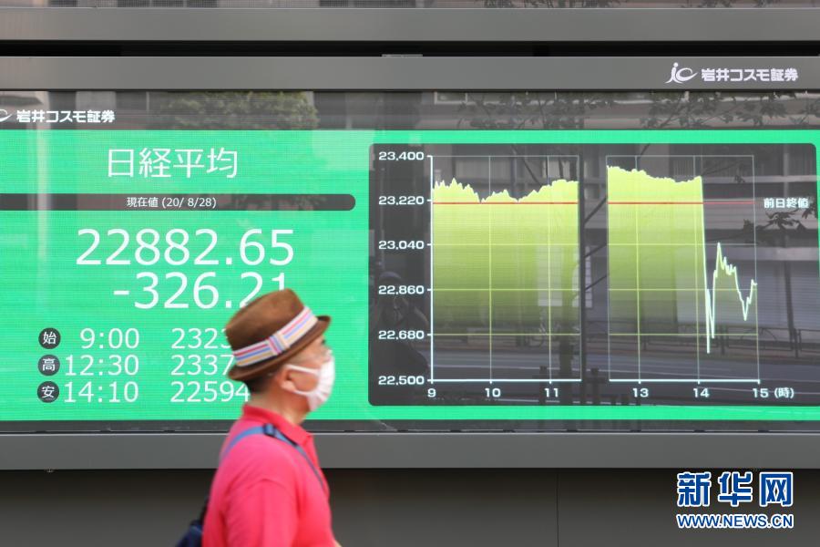 828日,日本東京街頭的一處電子股指顯示屏顯示,下午14時(shí)左右,受時(shí)任日本首相安倍晉三或因健康原因辭職影響,股市指數(shù)急速下跌。新華社記者 杜瀟逸 攝