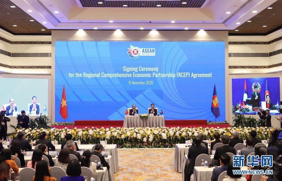 這是1115日在越南首都河內(nèi)拍攝的區(qū)域全面經(jīng)濟(jì)伙伴關(guān)系協(xié)定(RCEP)簽署儀式現(xiàn)場。新華社/越通社