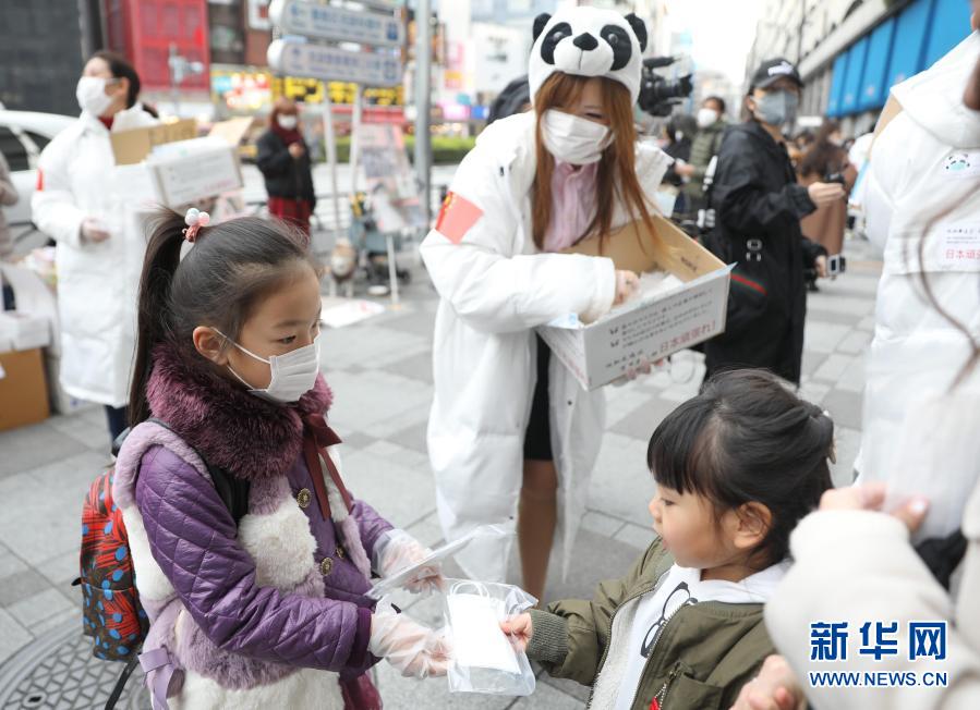 229日,在日本東京的池袋站前,在日華僑華人志愿者團(tuán)體口罩熊貓行動(dòng)小組向當(dāng)?shù)孛癖娒赓M(fèi)發(fā)放口罩,一名小志愿者(左)將兒童用口罩送給日本小朋友。新華社記者 杜瀟逸 攝