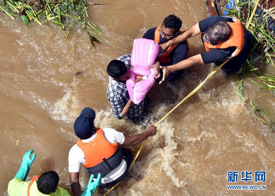1018日,救援人員從印度海得拉巴一處被洪水圍困的房屋中救出一名嬰兒。新華社發(fā)