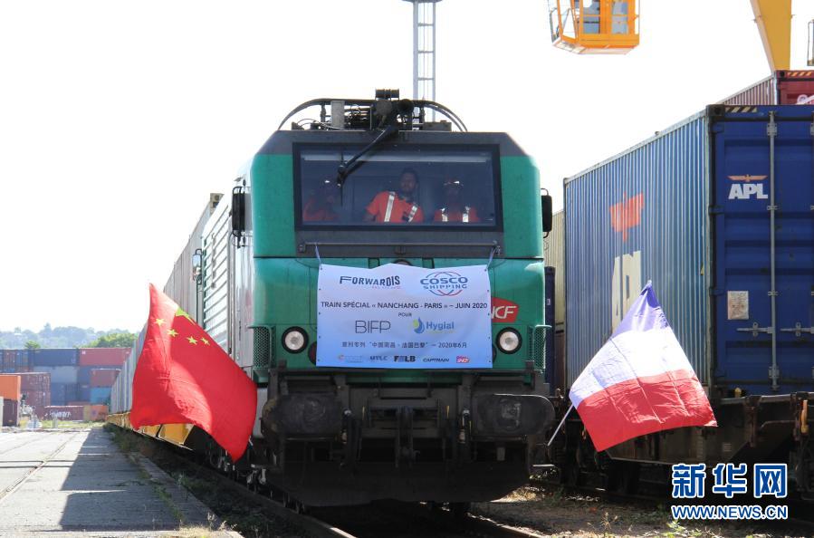 623日,滿載防疫物資的中歐班列抵達(dá)法國巴黎東南郊的瓦朗通,此次班列是中法首趟抗疫物資專列。新華社記者 徐永春 攝
