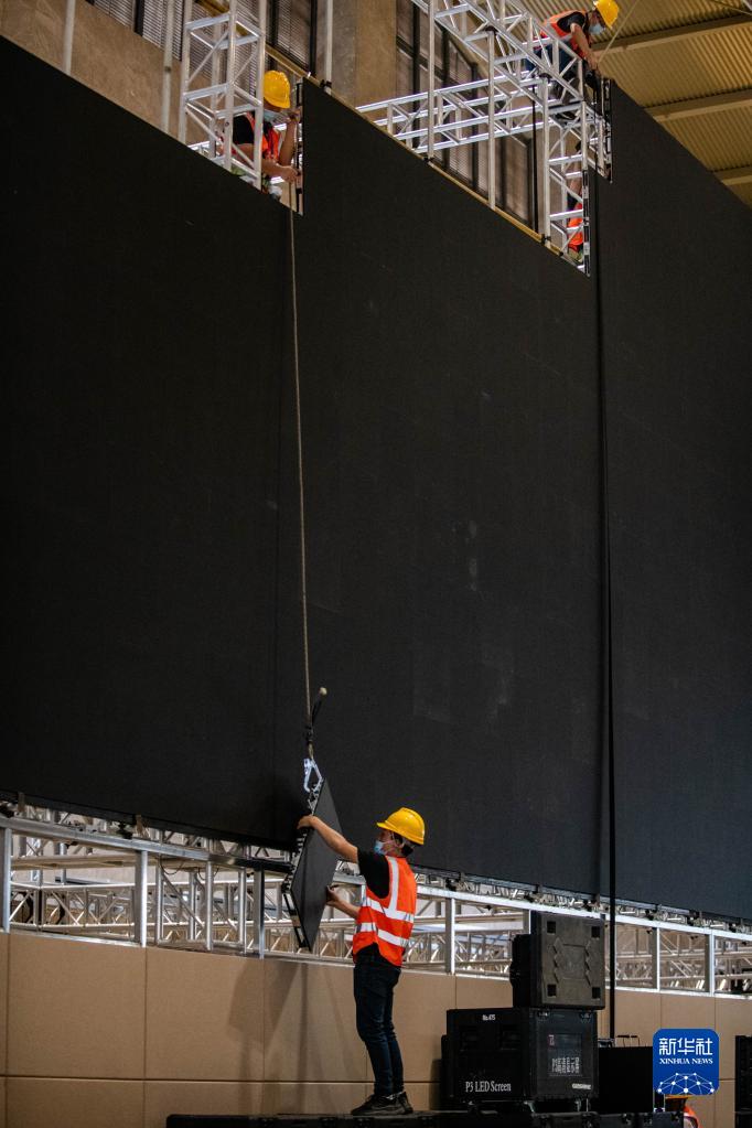在昆明滇池國際會(huì)展中心,工作人員正在搭建會(huì)場和新聞中心。施工人員均已接種兩劑新冠肺炎疫苗,每天進(jìn)場還要測體溫、戴口罩。會(huì)場相關(guān)設(shè)備將使用可重復(fù)利用的材料,會(huì)場不進(jìn)行油漆粉刷、噴涂,也不鋪設(shè)地毯。