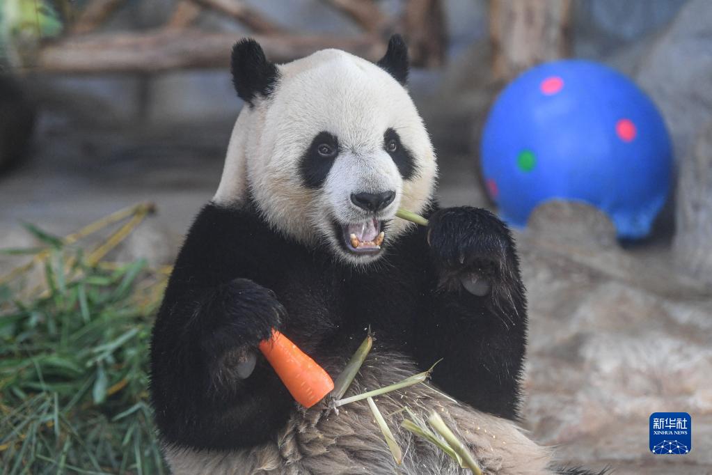 在位于??诘暮D蠠釒б吧鷦?dòng)植物園,大熊貓“舜舜”在享用美食(6月14日攝)。新華社記者 蒲曉旭 攝