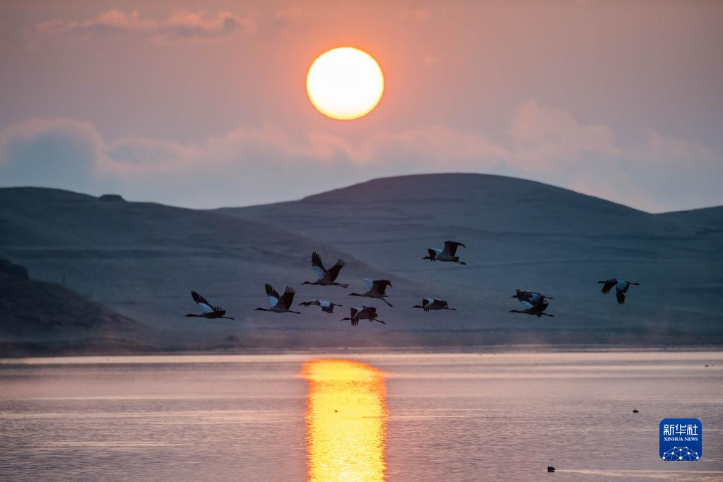 日出時(shí)分,黑頸鶴在云南省昭通市大山包黑頸鶴國家級(jí)自然保護(hù)區(qū)飛翔(2月25日攝)。新華社記者 胡超 攝