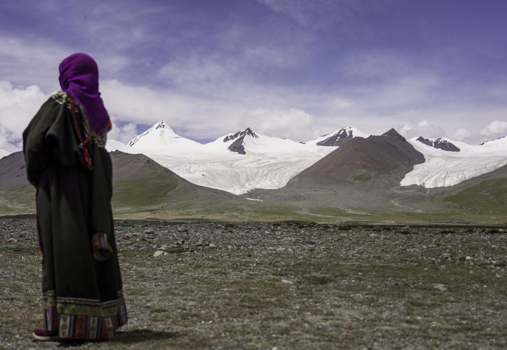 2020年8月15日,在青海省玉樹藏族自治州,牧民在雪山腳下遠(yuǎn)眺崗加曲巴冰川。新華社記者吳剛攝