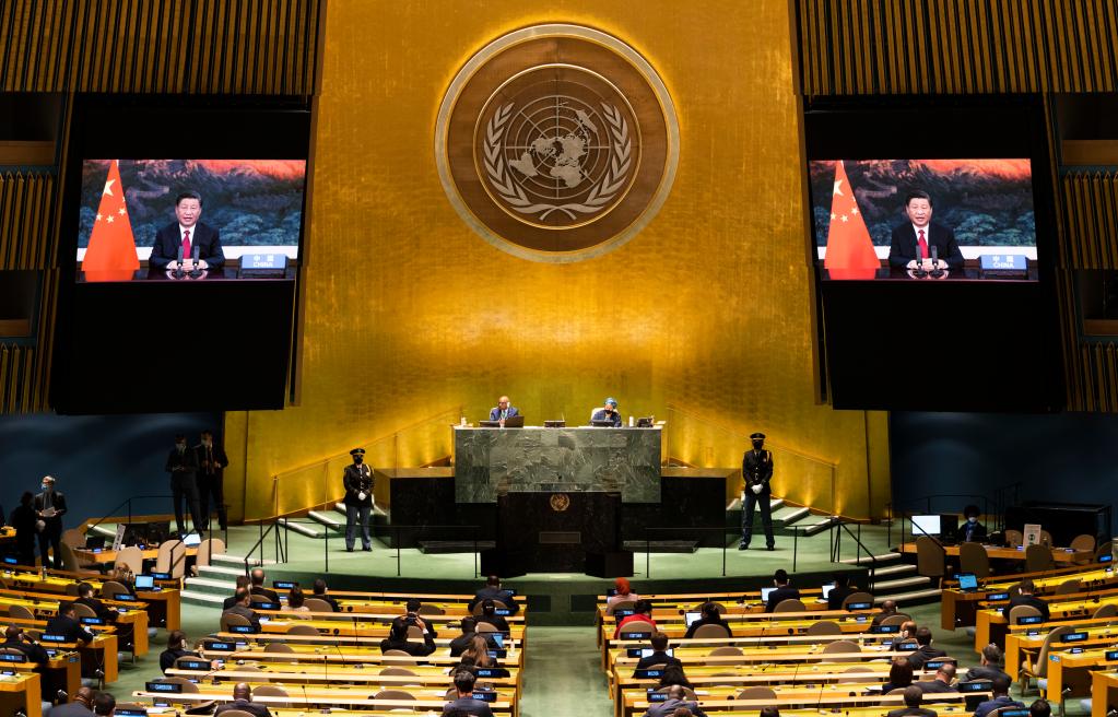 2021年9月21日,習(xí)近平在北京以視頻方式出席第七十六屆聯(lián)合國(guó)大會(huì)一般性辯論并發(fā)表重要講話。新華社記者王迎攝