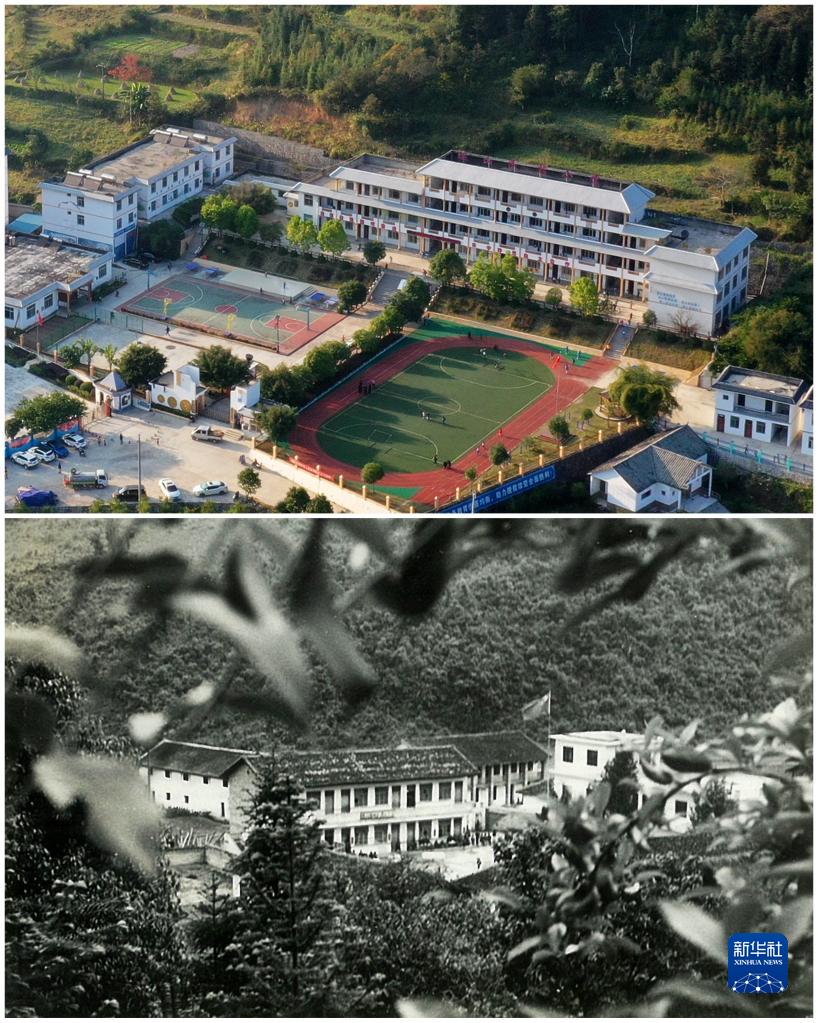 拼版照片:上圖為2019年11月5日拍攝的貴州省荔波縣瑤山民族小學(xué)新貌(無人機照片,新華社記者楊文斌攝);下圖為荔波縣瑤山民族小學(xué)舊貌(資料照片)。新華社發(fā)