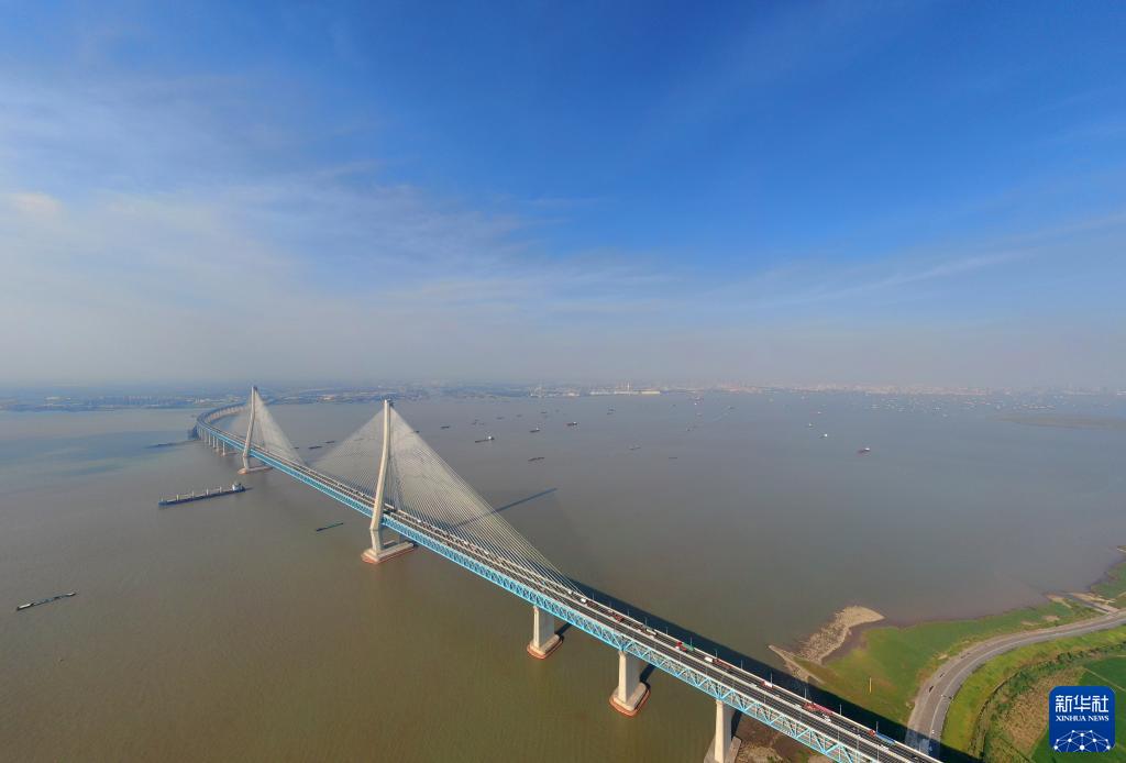 這是8月31日拍攝的滬蘇通長江公鐵大橋(無人機(jī)照片)。新華社發(fā)(許叢軍 攝)