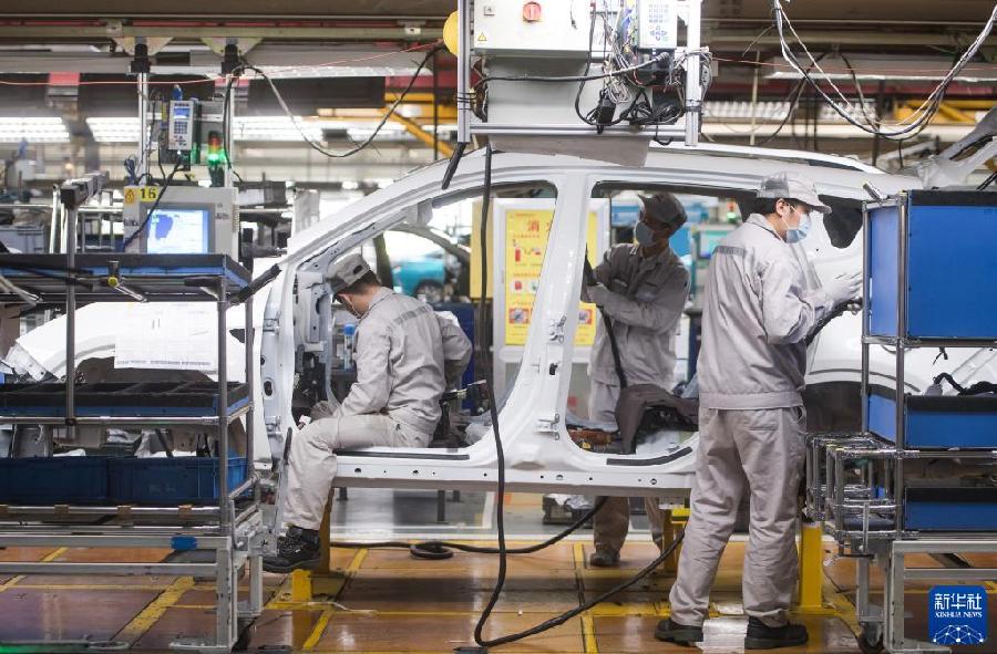2020年3月24日,工人在湖北武漢東風(fēng)乘用車公司工廠總裝車間的流水線上作業(yè)。2020年3月下旬左右,武漢各企業(yè)開(kāi)始陸續(xù)復(fù)工復(fù)產(chǎn)。新華社記者 肖藝九 攝