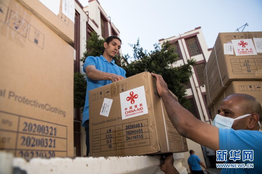 5月10日,在埃及首都開羅,工作人員搬運(yùn)中國政府援助的第二批抗疫物資。新華社記者 鄔惠我 攝