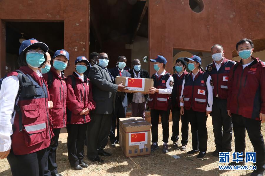 5 月 19 日,在津巴布韋中馬紹納蘭省的姆武爾維醫(yī)院,中國抗疫醫(yī)療專家組為當(dāng)?shù)蒯t(yī)療機(jī)構(gòu)捐贈(zèng)醫(yī)療物資。新華社記者 張玉亮 攝