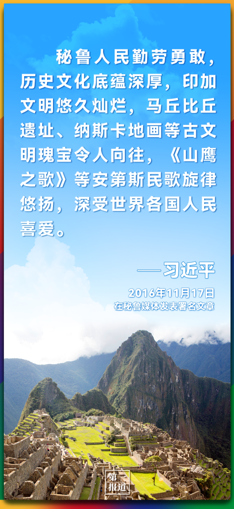 2016年對秘魯進(jìn)行國事訪問期間,習(xí)近平主席在時(shí)任秘魯總統(tǒng)庫琴斯基的陪同下,出席了中拉文化交流年閉幕式。途中參觀《文明的長河——中拉文明互鑒》圖片展時(shí),共同欣賞了中秘兩國樂隊(duì)一起演奏的中國民歌《沂蒙山歌》和秘魯民歌《山鷹之歌》。