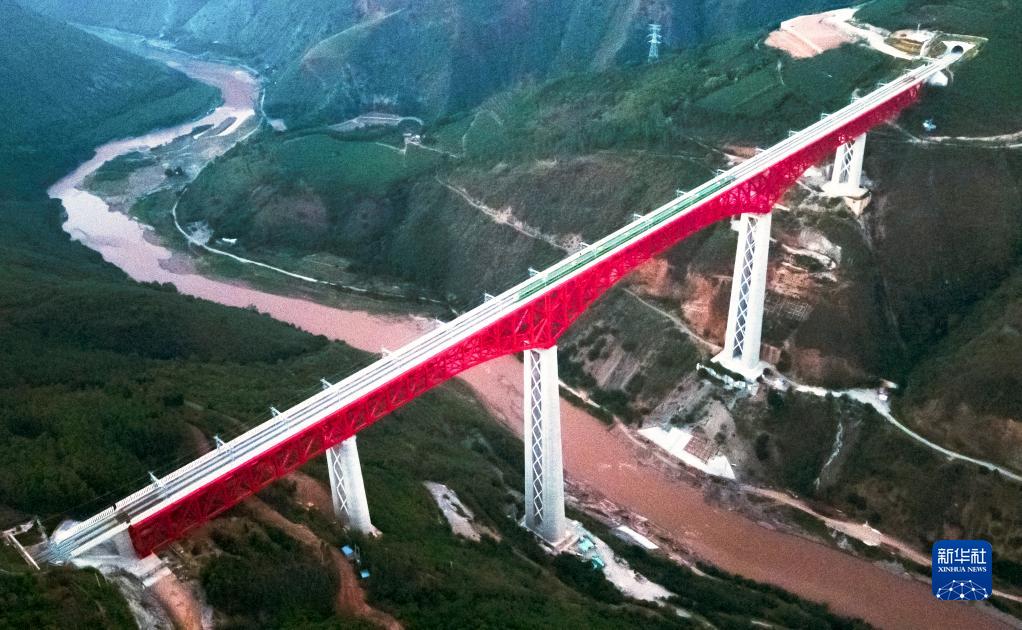 中老鐵路首發(fā)列車駛過(guò)中國(guó)云南省元江哈尼族彝族傣族自治縣境內(nèi)的元江雙線特大橋(12月3日攝,無(wú)人機(jī)照片)。新華社記者 王冠森 攝