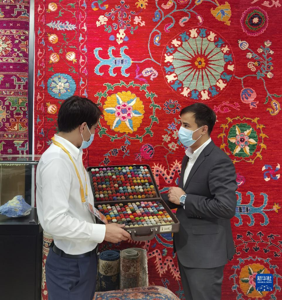 11月5日,阿富汗參展商阿里·法伊茲(右)在第四屆進(jìn)博會(huì)阿富汗手工羊毛地毯展臺(tái)忙碌。新華社記者 吳宇 攝