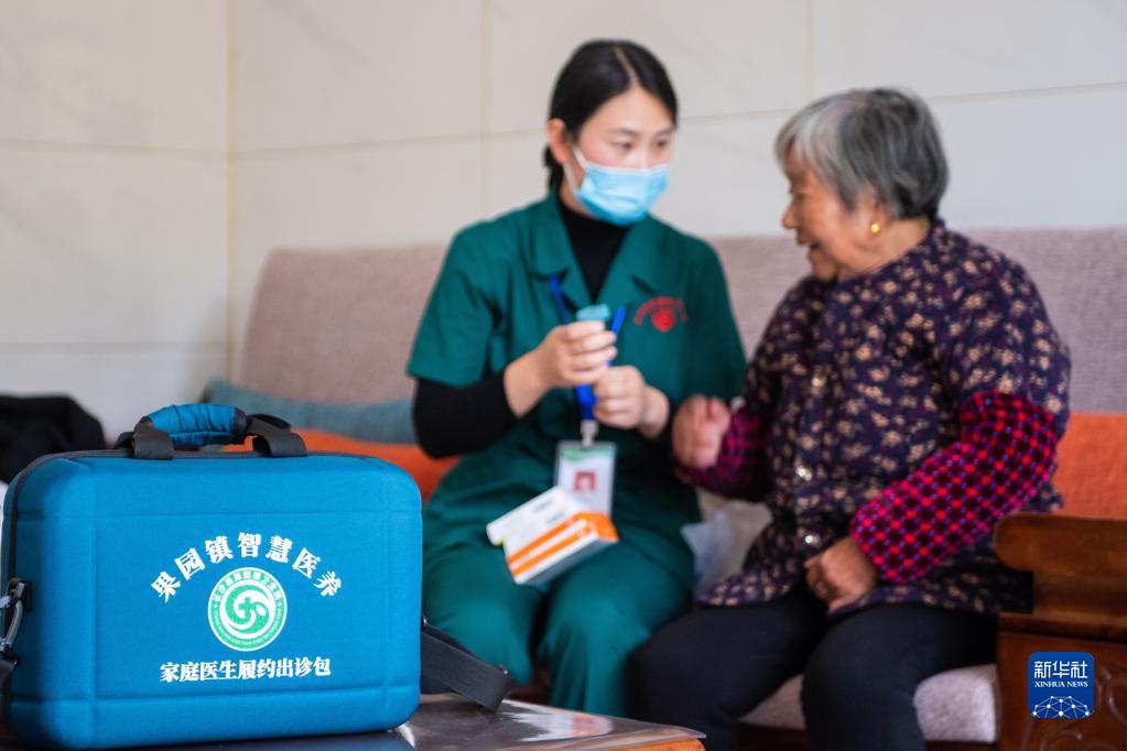 11月12日,在湖南省長(zhǎng)沙市長(zhǎng)沙縣果園鎮(zhèn)楊泗廟社區(qū),醫(yī)務(wù)人員劉敏指導(dǎo)居家老人用藥。新華社記者 陳思汗 攝