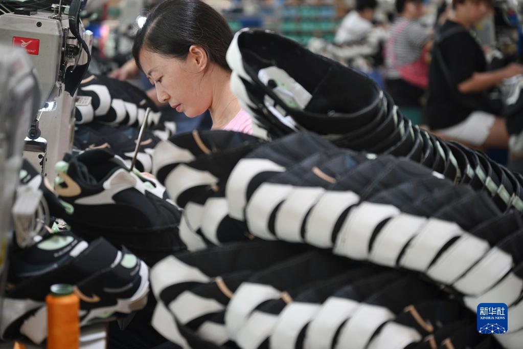 在位于福建省泉州市的鴻星爾克集團(tuán)鴻榮輕工公司車(chē)間,工人在制鞋生產(chǎn)線上作業(yè)(7月30日攝)。泉州市是我國(guó)重要的制造業(yè)基地,民營(yíng)企業(yè)較多。新華社記者 宋為偉 攝