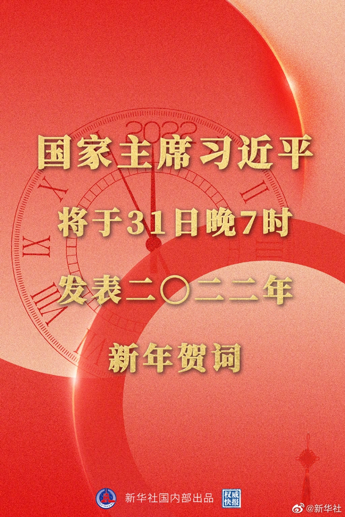 新華社北京12月30日電 國家主席習(xí)近平將于31日晚7時(shí)通過中央廣播電視總臺和互聯(lián)網(wǎng),發(fā)表二〇二二年新年賀詞。中央廣播電視總臺所屬中央電視臺綜合頻道、新聞頻道、中文國際頻道、4K頻道,中國國際電視臺各外語頻道,中央人民廣播電臺,中國國際廣播電臺,以及人民網(wǎng)、新華網(wǎng)、央視新聞客戶端等中央主要新聞媒體所屬網(wǎng)站、新媒體平臺將準(zhǔn)時(shí)播出。
