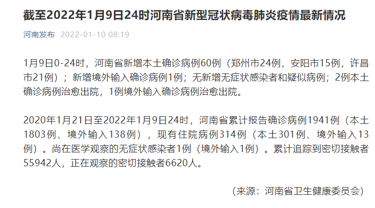 2020年1月21日至2022年1月9日24時,河南省累計報告確診病例1941例(本土1803例、境外輸入138例),現(xiàn)有住院病例314例(本土301例、境外輸入13例)。尚在醫(yī)學觀察的無癥狀感染者1例(境外輸入1例)。累計追蹤到密切接觸者55942人,正在觀察的密切接觸者6620人。