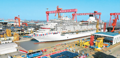 日前,中國首制大型郵輪在中國船舶集團(tuán)旗下上海外高橋造船有限公司船塢內(nèi)順利實現(xiàn)塢內(nèi)起浮。這是大型郵輪建造的重要節(jié)點,標(biāo)志著該項目向著完工交付的總目標(biāo)邁出關(guān)鍵一步。去年末,中國船舶集團(tuán)總部由北京遷往上海。本報記者 沈文敏攝