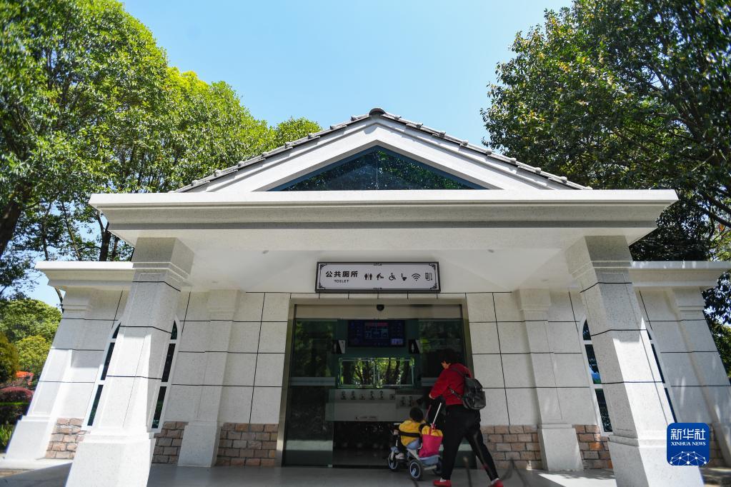 市民帶著小朋友進入位于湖南長沙縣星沙中心廣場的智慧廁所(2021年3月24日攝)。新華社記者 陳澤國 攝