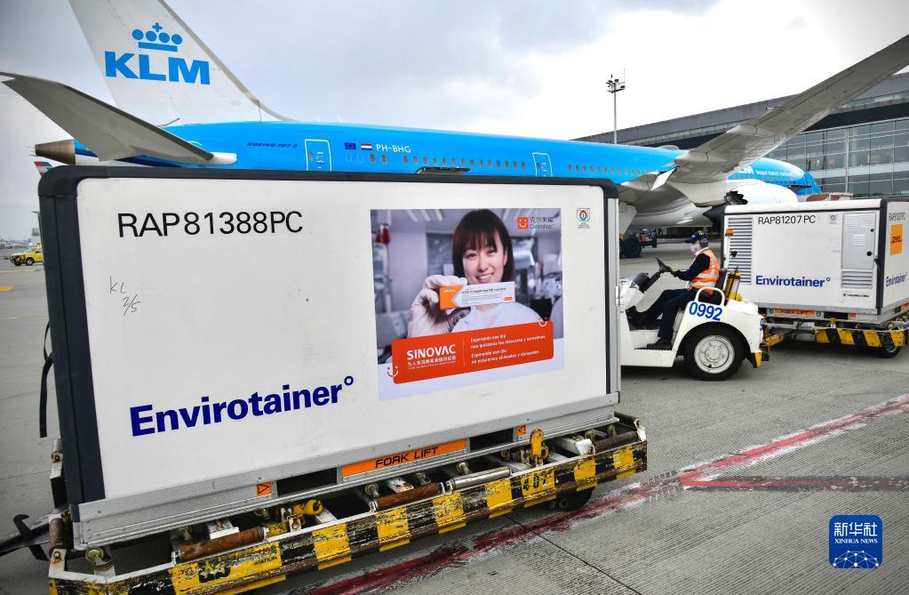 這是2021年3月6日在哥倫比亞波哥大埃爾多拉多國際機(jī)場拍攝的剛剛完成卸貨的科興疫苗。新華社發(fā)(哥倫比亞總統(tǒng)府供圖)
