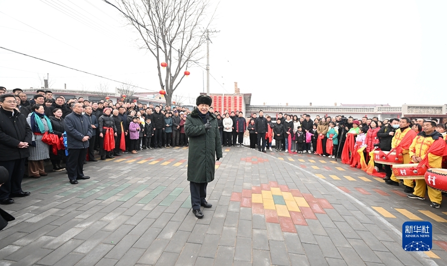 村文化廣場上十分熱鬧,村民們打起威風(fēng)鑼鼓、扭起秧歌歡慶佳節(jié)。看到總書記來了,人們高興地歡呼起來。習(xí)近平對鄉(xiāng)親們說,我們黨的根本宗旨就是為人民群眾辦好事,為人民群眾幸福生活拼搏、奉獻(xiàn)、服務(wù)。我們?nèi)缙诖蜈A了脫貧攻堅戰(zhàn),如期實現(xiàn)了全面建成小康社會目標(biāo),現(xiàn)在踏上了全面建設(shè)社會主義現(xiàn)代化國家新征程。建設(shè)現(xiàn)代化國家離不開農(nóng)業(yè)農(nóng)村現(xiàn)代化,要繼續(xù)鞏固脫貧攻堅成果,扎實推進鄉(xiāng)村振興,讓群眾生活更上一層樓,在推進農(nóng)業(yè)農(nóng)村現(xiàn)代化中越走越有奔頭。