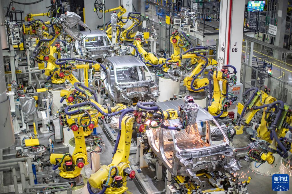 重慶一家新能源汽車企業(yè)使用智能化焊接機器人進(jìn)行焊接作業(yè)(2021年4月2日攝)。新華社記者 黃偉 攝