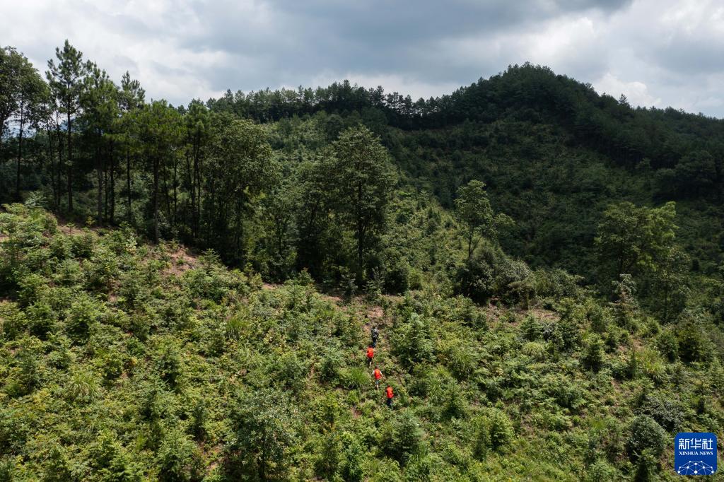 在浙江省杭州市臨安區(qū)太湖源鎮(zhèn)上陽村重陽塢,志愿者在“碳中和林”進(jìn)行日常巡查(2021年7月20日攝,無人機照片)。新華社記者 徐昱 攝