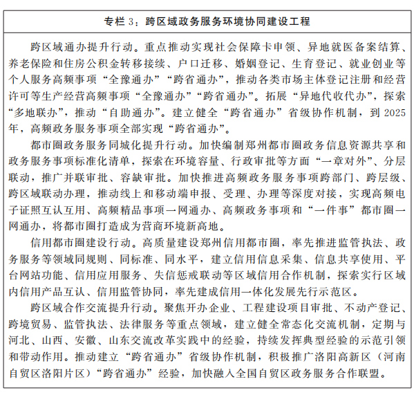 提升政務(wù)服務(wù)便利度。加快推進(jìn)政務(wù)服務(wù)標(biāo)準(zhǔn)化,持續(xù)優(yōu)化《河南省政務(wù)服務(wù)事項(xiàng)基本目錄》,制定全省統(tǒng)一的政務(wù)服務(wù)標(biāo)準(zhǔn)化實(shí)施細(xì)則,全面建成與國(guó)家和行業(yè)標(biāo)準(zhǔn)體系協(xié)調(diào)一致、結(jié)構(gòu)統(tǒng)一,覆蓋省、市、縣、鄉(xiāng)、村五級(jí)的政務(wù)服務(wù)標(biāo)準(zhǔn)化體系,實(shí)現(xiàn)同一事項(xiàng)全省無(wú)差別受理、同標(biāo)準(zhǔn)辦理,爭(zhēng)創(chuàng)一批政務(wù)服務(wù)標(biāo)準(zhǔn)化國(guó)家級(jí)試點(diǎn)。優(yōu)化再造政務(wù)服務(wù)流程,持續(xù)壓縮政務(wù)服務(wù)事項(xiàng)辦理時(shí)限,全面推行一窗通辦、一網(wǎng)通辦、全程網(wǎng)辦服務(wù)模式,推出一批憑營(yíng)業(yè)執(zhí)照和居民身份證可自助辦理的“無(wú)人審批”事項(xiàng),推動(dòng)實(shí)現(xiàn)全省除涉密之外的所有政務(wù)服務(wù)事項(xiàng)實(shí)行“不見面審批”、市縣級(jí)政務(wù)服務(wù)事項(xiàng)“一窗”分類受理全覆蓋。“十四五”期間,普通高壓客戶辦電環(huán)節(jié)壓縮至4個(gè)以內(nèi),其中符合投資至規(guī)劃紅線要求的辦電環(huán)節(jié)壓縮至3個(gè)以內(nèi),對(duì)通過(guò)工商信息推送“主動(dòng)辦電”的辦電環(huán)節(jié)壓縮至2個(gè)以內(nèi)。用水、用氣報(bào)裝(含施工)環(huán)節(jié)分別壓縮至2個(gè)、3個(gè)。精簡(jiǎn)辦事材料,全面清理證明事項(xiàng)和推行證明事項(xiàng)告知承諾制,推廣應(yīng)用以信用為基礎(chǔ)的容缺受理機(jī)制,創(chuàng)建一批“無(wú)證明城市”。創(chuàng)新政務(wù)服務(wù)模式,探索無(wú)人工干預(yù)的智慧審批、“無(wú)感智辦”等新模式,逐步拓展“秒報(bào)”“秒批”服務(wù)事項(xiàng)范圍和“最小顆粒化”政務(wù)服務(wù)事項(xiàng)覆蓋面,加快互聯(lián)網(wǎng)應(yīng)用適老化及無(wú)障礙改造升級(jí)。實(shí)施跨區(qū)域政務(wù)服務(wù)通辦提升行動(dòng),聚焦保障改善民生,加快統(tǒng)一通辦業(yè)務(wù)規(guī)則和標(biāo)準(zhǔn),優(yōu)化通辦業(yè)務(wù)模式,推動(dòng)更多政務(wù)服務(wù)事項(xiàng)“同事同標(biāo)”,實(shí)現(xiàn)企業(yè)和群眾高頻事項(xiàng)“全豫通辦”“跨省通辦”。到2025年,政務(wù)服務(wù)事項(xiàng)“一網(wǎng)通辦”可辦率、“最多跑一次”實(shí)現(xiàn)率均達(dá)到100%,出口退稅平均辦理時(shí)間壓縮至3個(gè)工作日以內(nèi),普通高壓客戶辦電(不含配套工程施工)、用水報(bào)裝(含施工)、用氣報(bào)裝(小型含外線施工)耗時(shí)分別壓縮至18個(gè)、10個(gè)、10個(gè)工作日。