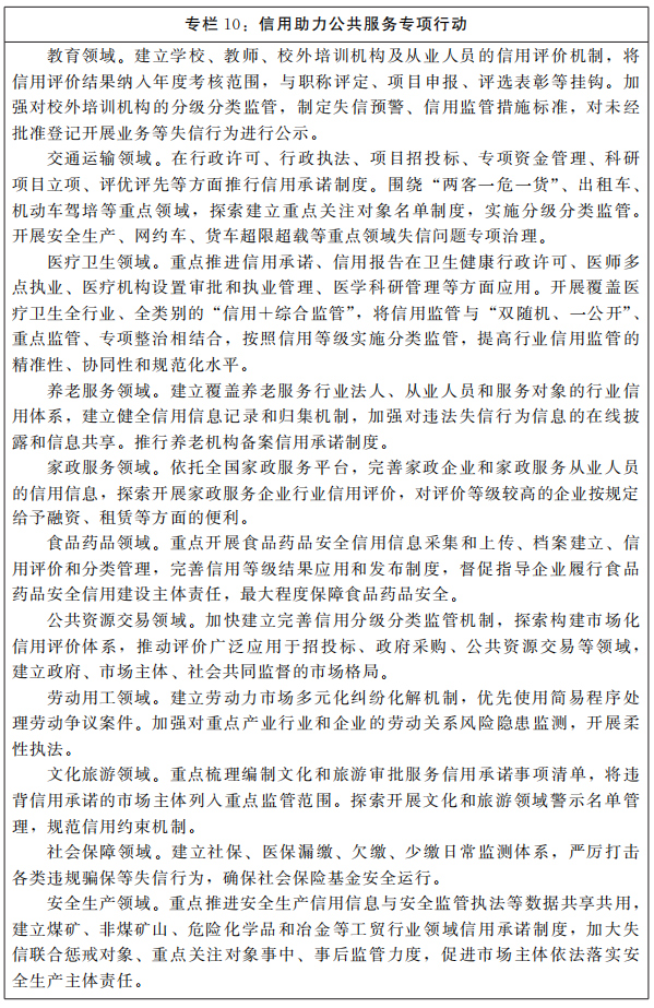 以豐富拓展“信易+”典型應(yīng)用場(chǎng)景為載體,創(chuàng)新完善社會(huì)化、市場(chǎng)化守信激勵(lì)措施,不斷增進(jìn)民生福祉、提升群眾幸福感。加強(qiáng)公共服務(wù)領(lǐng)域社會(huì)信用體系建設(shè),聚焦教育、交通運(yùn)輸、醫(yī)療衛(wèi)生、養(yǎng)老、家政、食品藥品、公共資源交易、勞動(dòng)用工、文化旅游、社會(huì)保障等重點(diǎn)領(lǐng)域,健全從業(yè)人員信用檔案,優(yōu)化服務(wù)機(jī)構(gòu)和從業(yè)人員信用評(píng)價(jià)體系,完善相關(guān)市場(chǎng)主體的分級(jí)分類監(jiān)管,提升“監(jiān)管+服務(wù)”水平。建立常態(tài)化風(fēng)險(xiǎn)預(yù)警和防范機(jī)制,提升民生領(lǐng)域失信監(jiān)測(cè)預(yù)警能力。鼓勵(lì)各地、各部門聚焦文化旅游、數(shù)字生活、綠色生態(tài)等場(chǎng)景,重點(diǎn)開發(fā)“信易游”“信易醫(yī)”“信易租”“信易行”“信易家政”等民生領(lǐng)域“信易+”應(yīng)用,構(gòu)建多元化、多渠道的“信易+”長(zhǎng)效發(fā)展機(jī)制。